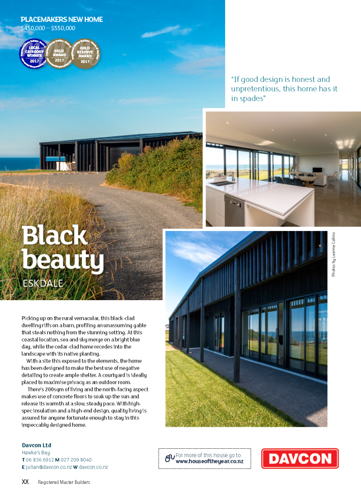 Picking up on the rural vernacular, this black-clad dwelling riffs on a barn, profiling an unassuming gable that steals nothing from the stunning setting. At this coastal location, sea and sky merge on a bright blue day, while the cedar-clad home recedes into the landscape with its native planting.