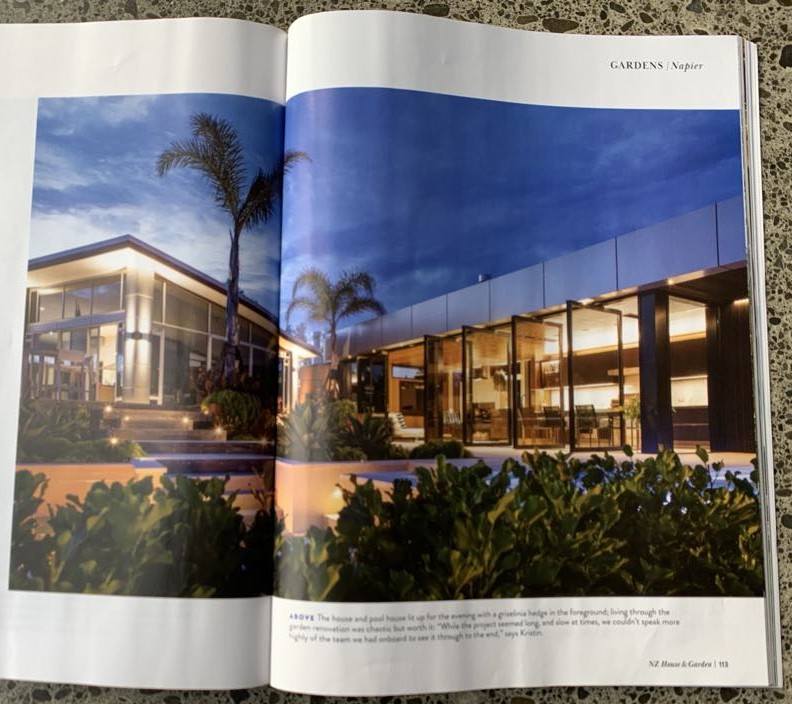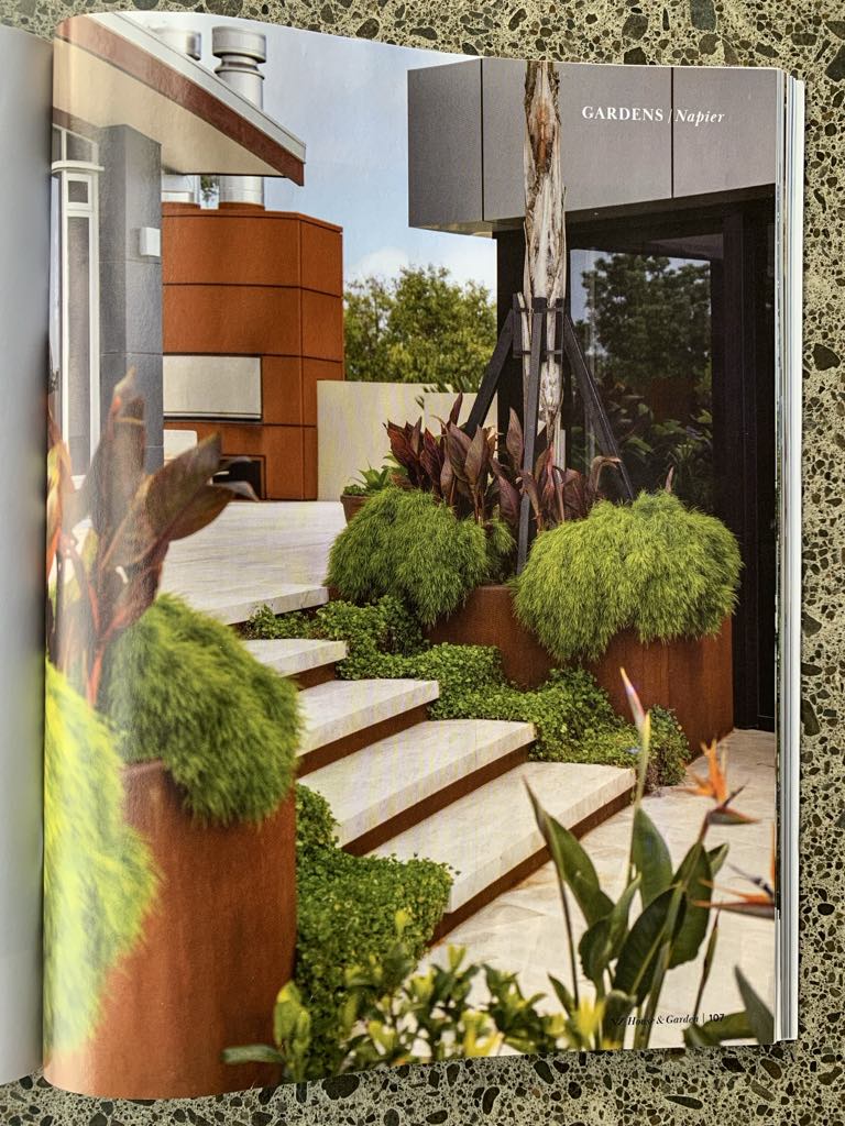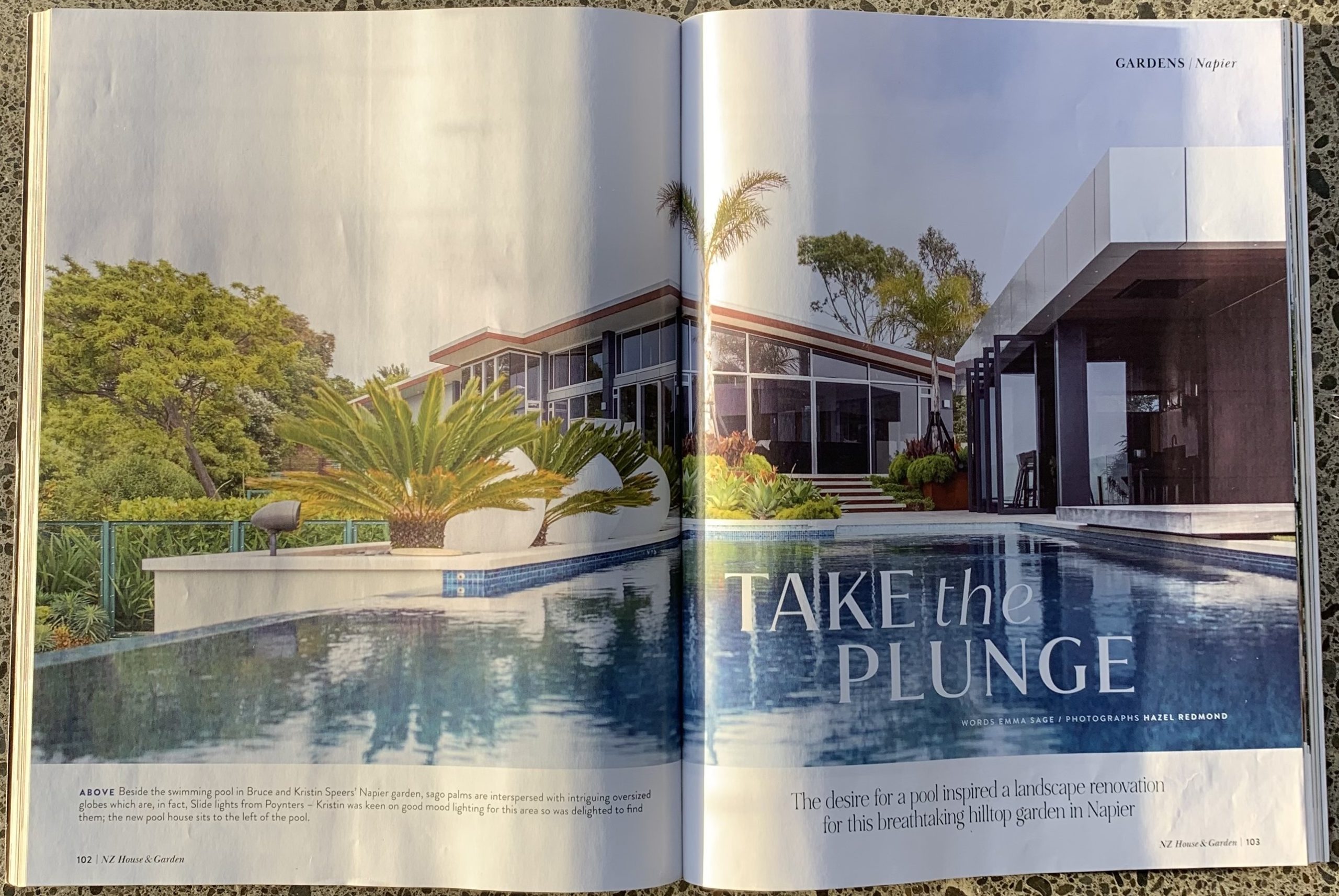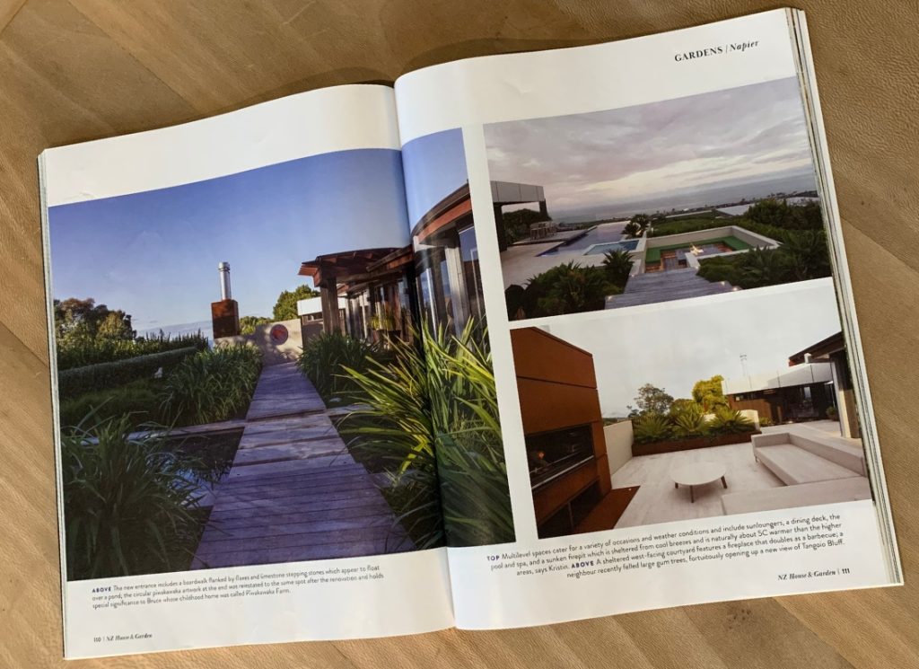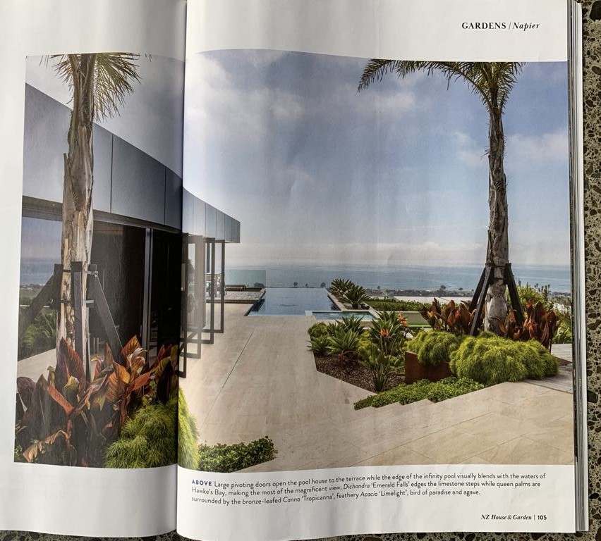 As cruise ships glide by or the weather rolls in, this garden high on the Bay View hills of Napier has become a property now befitting its location. But it wasn’t always like that. When Bruce and Kristin Speers bought the home from the original owners in 2014, the original landscaping was, as Bruce described it, “really quite grey limited to a concrete wraparound deck, paving slabs and stones. It didn’t quite do the place justice.” The couple wanted a property that not only suited the way they live and entertain but which complemented the enthralling view, which stretches from Mahia Peninsula around to Kidnappers. Bruce is a businessman with various directorships and Kristin used to work as a GP.